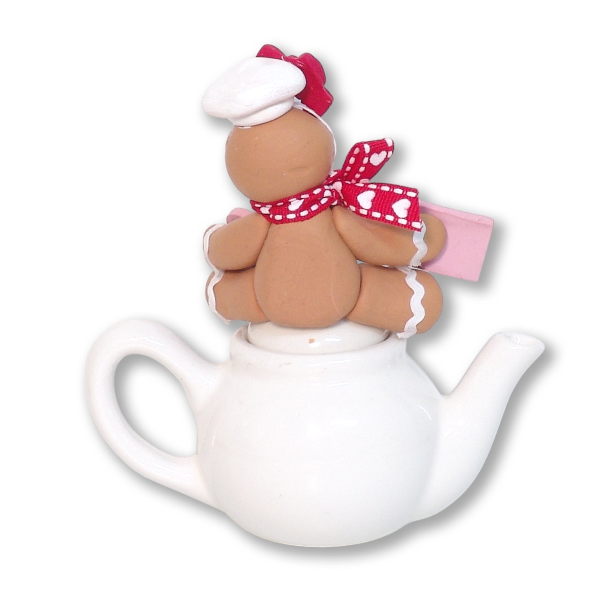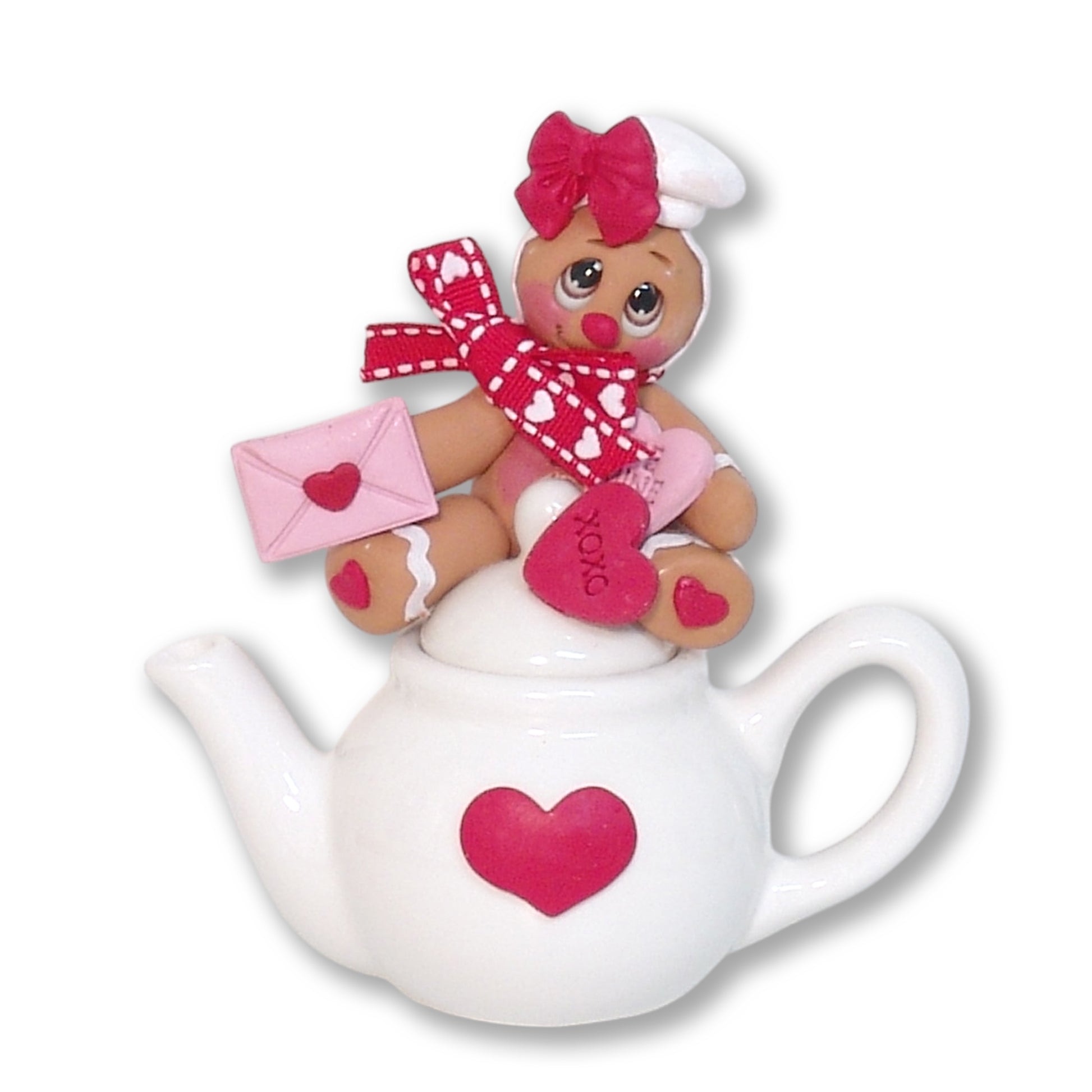 This cute little Gingy has a Valentine for you. He is sitting on a ceramic teapot decorated with Valentine hearts. It is two pieces. A great way to share the "Love". It is the Valentine that will last forever. It is a very detailed three-dimensional figurine. Great to send as a gift and then can be used as a remembrance on any shelf. Handmade from polymer clay and designed by me. Does NOT have a hook.
